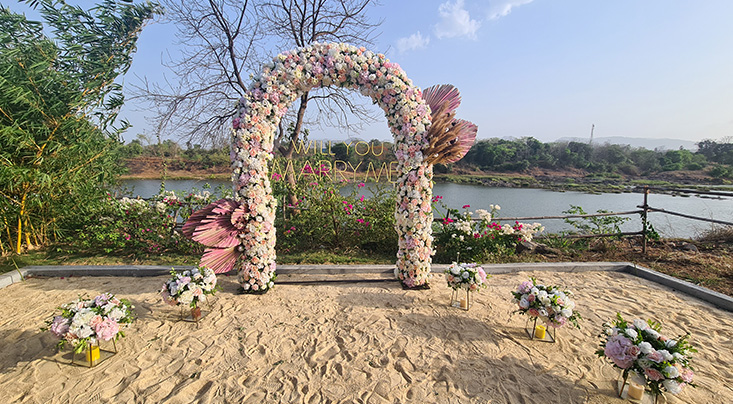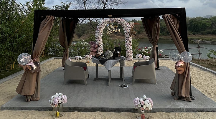 How would a riverside celebratory experience decked with aesthetic lighting and wholesome ornamental delights be? Come over and see for yourself! Not to forget, the sandy base introduces a beach-like vibe translating into a riveting scene. Birthdays, anniversaries, festive parties, or personalized euphoric get-togethers – we've curated a landscape for one and all.