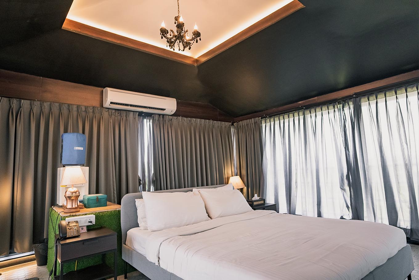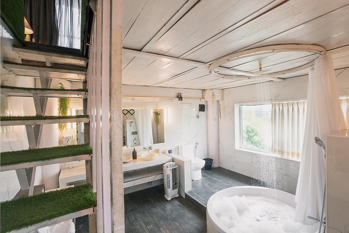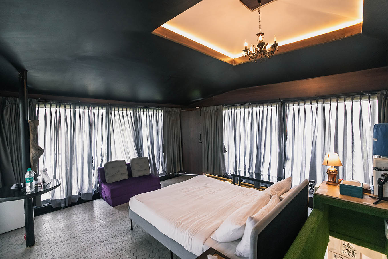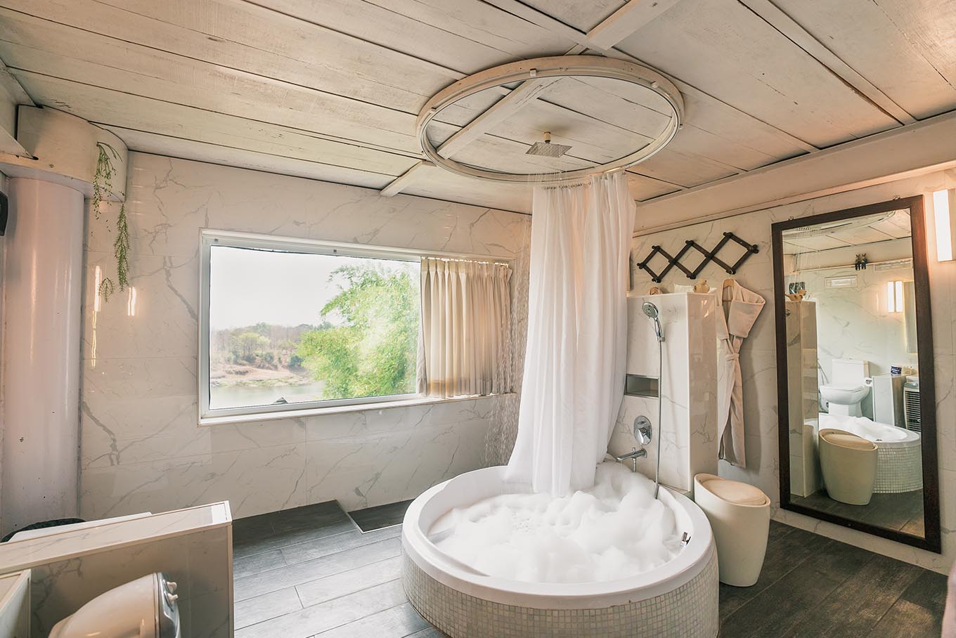 Surrounded by glass on all sides and a luxurious bathroom with sleek interiors and a circular bathtub on the lower floor, our glass rooms blend the privileges of royalty and transparent interiors, allowing you to continually appreciate the river, mountains, and greenery. To spice things up, the chandelier and the magnificently designed translucent-ceiling add to the charm.