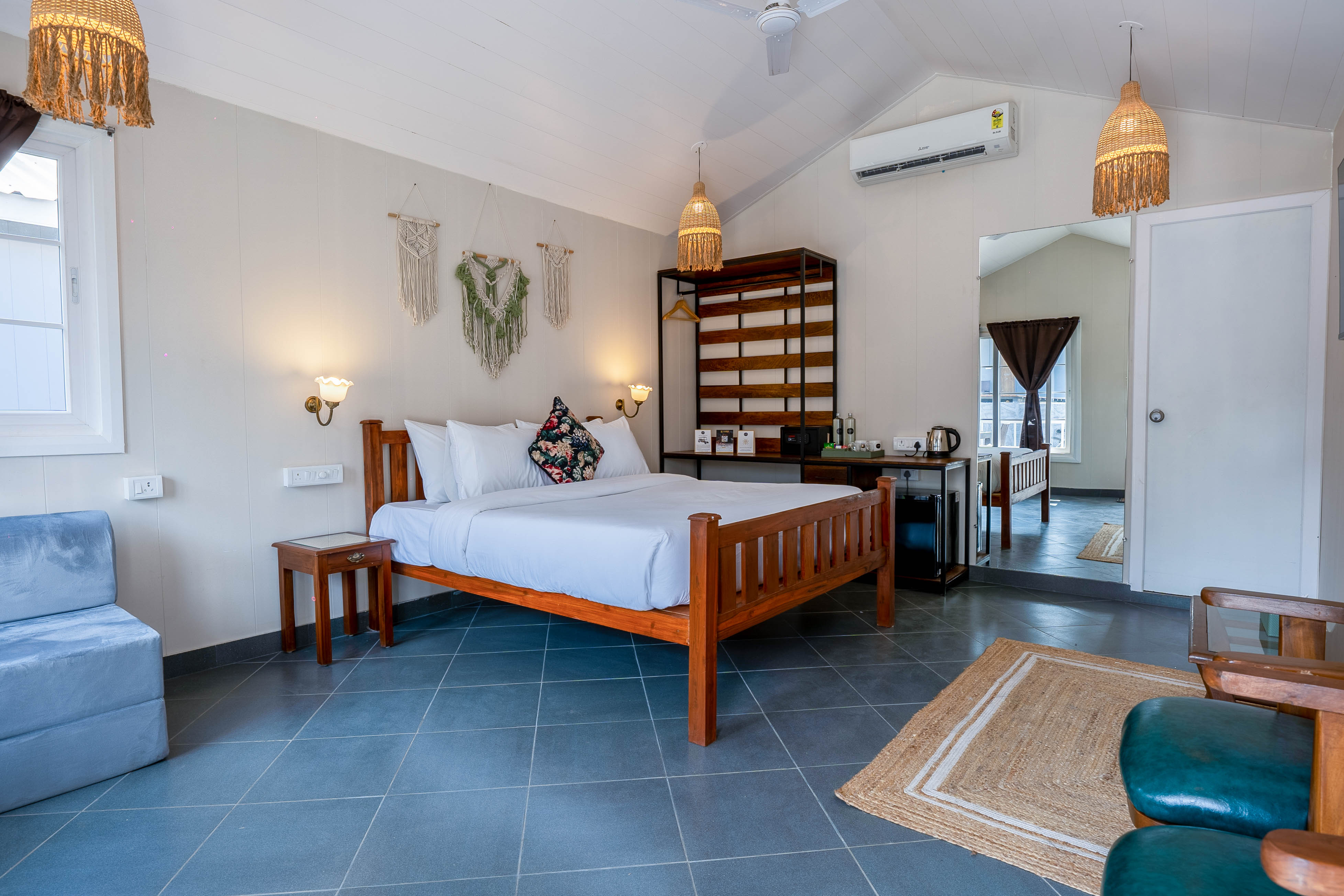 Step into the shimmering azure waters and embrace a uniquely designed experience in our Magnolia Pool View rooms, perfectly situated on the ground level for seamless access. These spacious rooms feature a plush queen-size bed, a versatile sofa-cum-bed, a private balcony, and a cozy patio, offering an ideal blend of comfort and elegance. Start your day with refreshing dips in the pool, unwind during sunlit afternoons and soak in the serene surroundings. Thoughtfully curated with a guest-centric approach, every detail ensures effortless poolside living, making your stay both relaxing and memorable.
