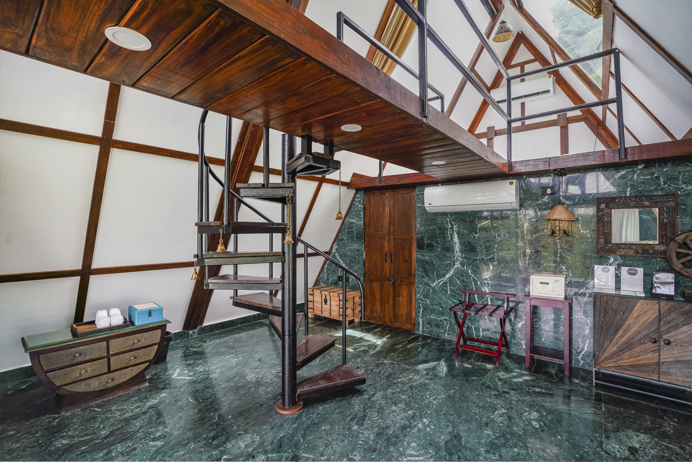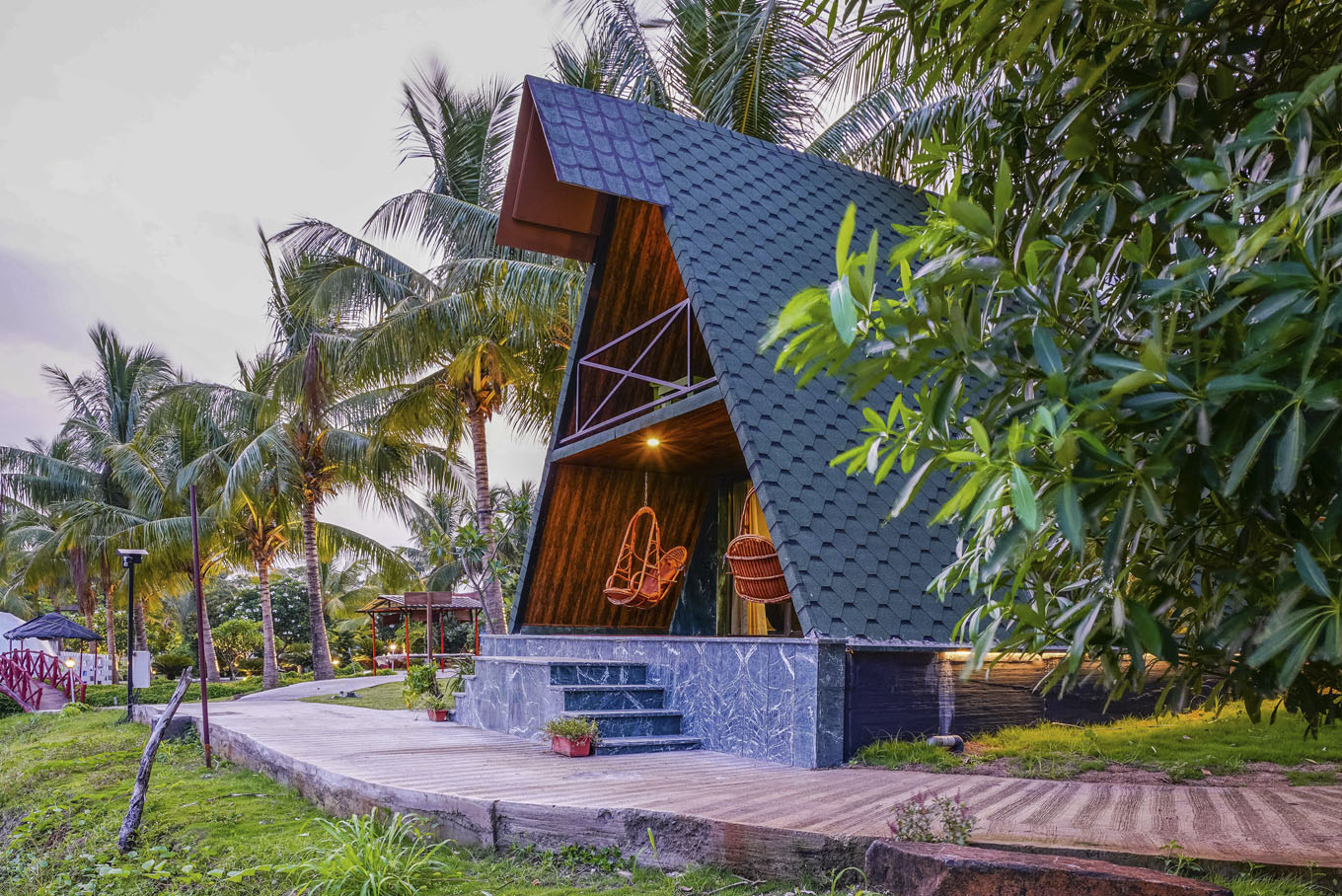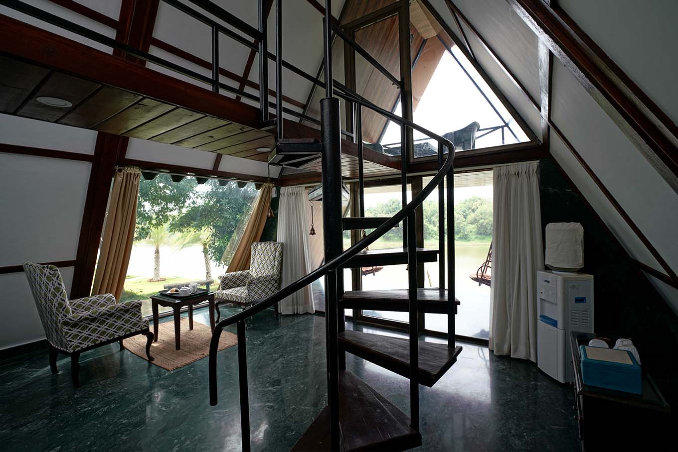 This A-shaped chalet comes in 2 levels. The lower level occupies the living room, bathroom and a comfortable open-air seating territory, while the upper level has a compact, minimalist room and sleek river view balcony. Even better, the glass windows bolster amplified natural lighting while making a perfect spot for unadulterated views of mother earth.