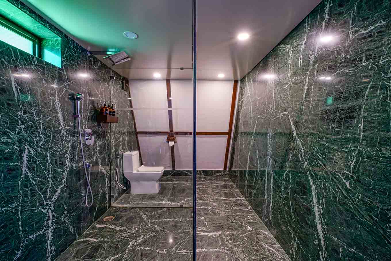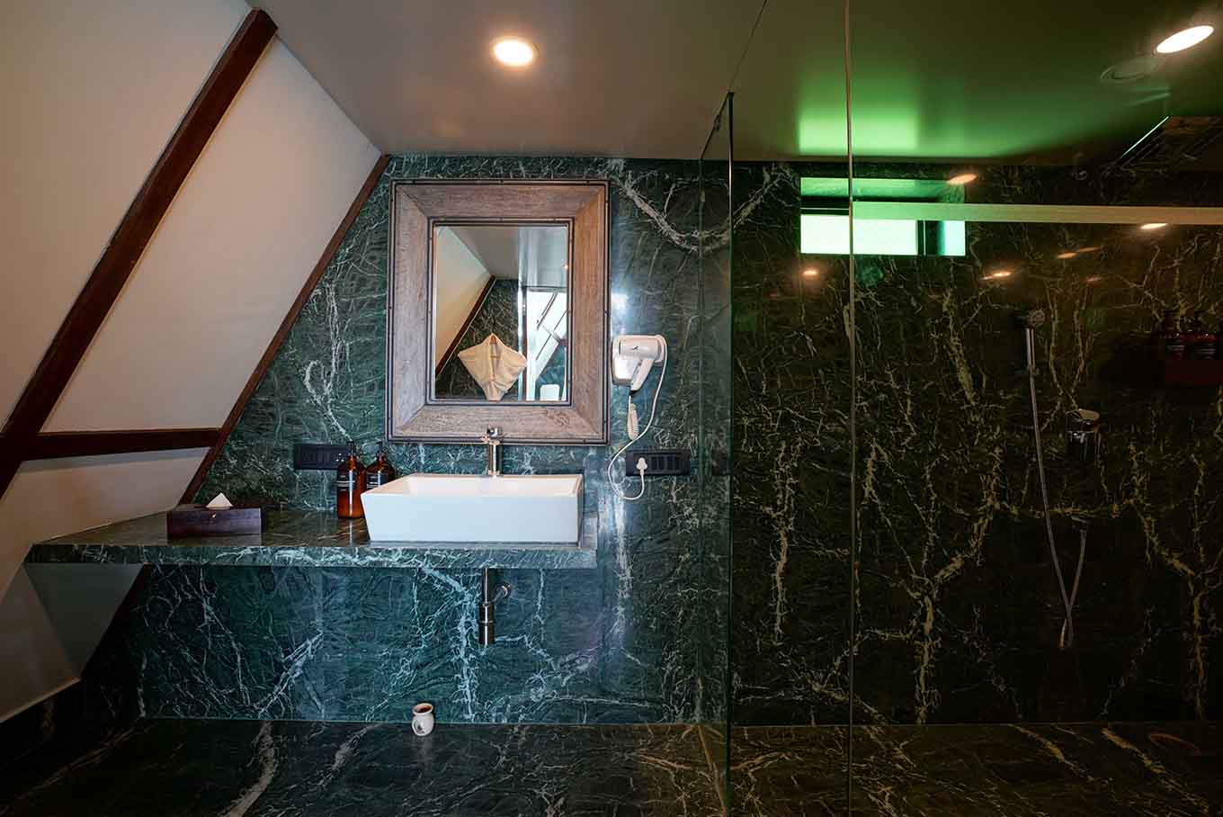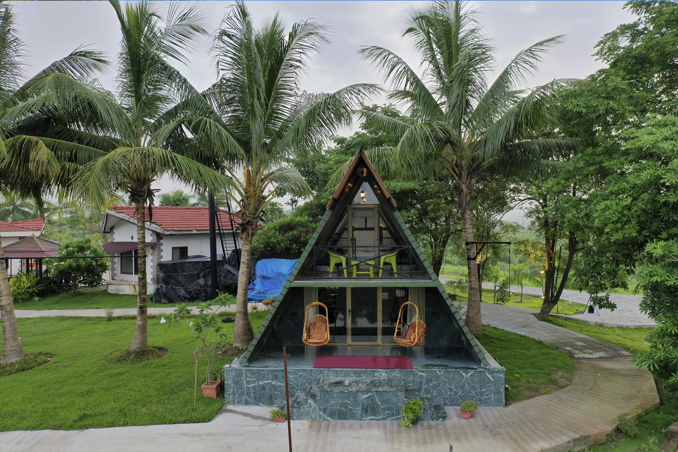 This A-shaped chalet comes in 2 levels. The lower level occupies the living room, bathroom and a comfortable open-air seating territory, while the upper level has a compact, minimalist room and sleek river view balcony. Even better, the glass windows bolster amplified natural lighting while making a perfect spot for unadulterated views of mother earth.