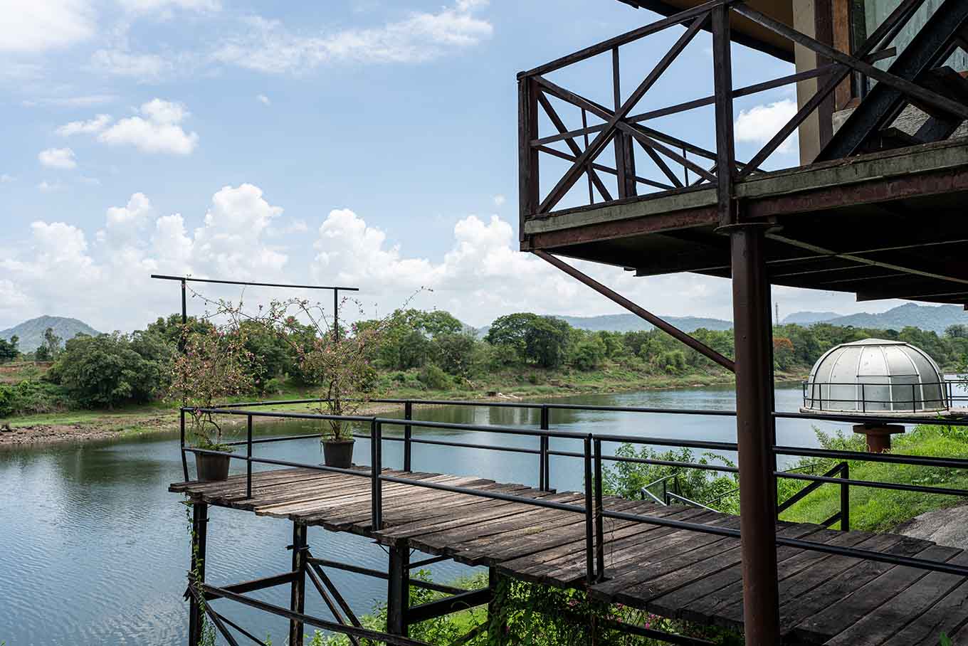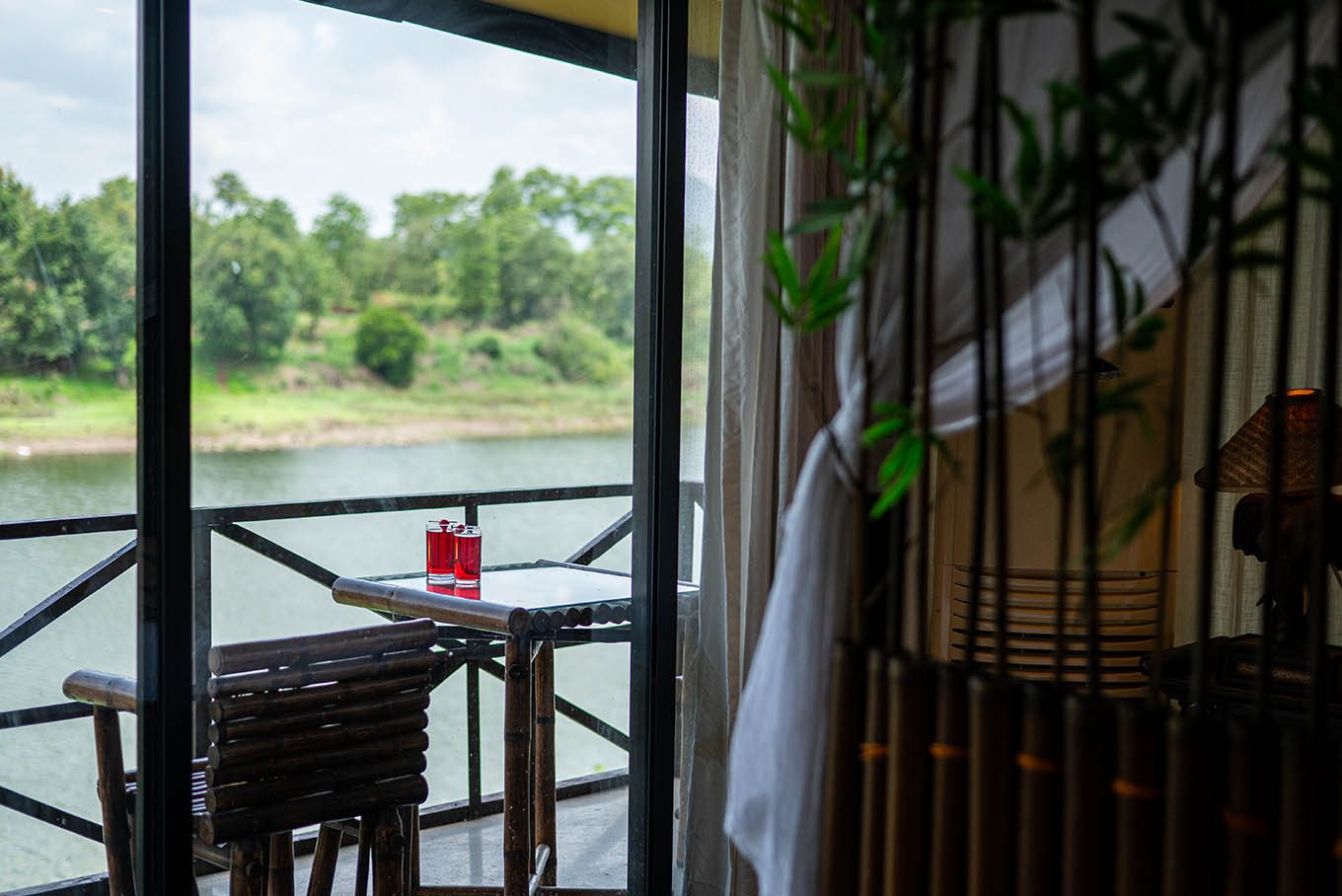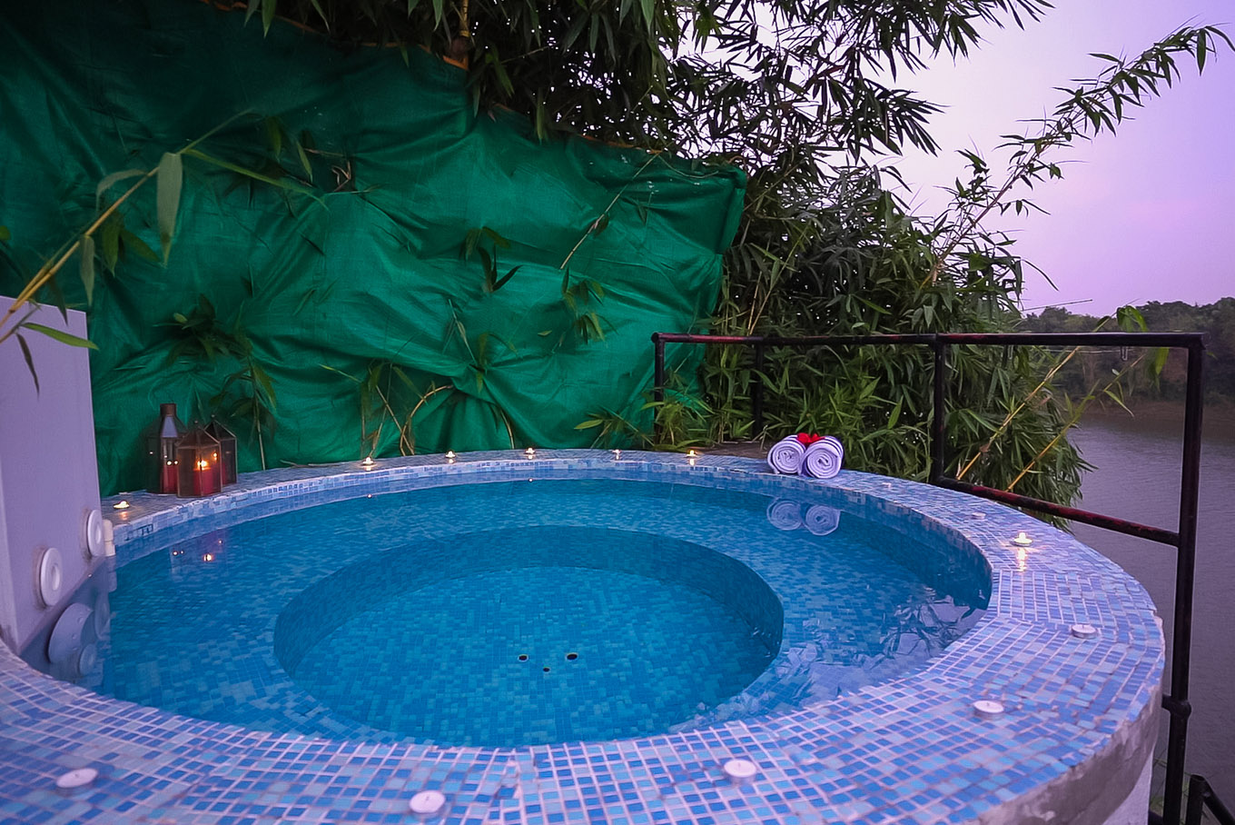 Walking up a charming little spiral staircase will lead you right to the center of the beautiful chalet, built around a majestic Peepul Tree. The seating area by the river, and the dining table that overlooks the football field, are perfect for long conversations or pensive musings. With a grand, four-poster bed that can accommodate two, the Tree House is the perfect hideout for a couple looking to get lost in nature. Please note, the plunge pool in the Tree house, is not a jacuzzi.