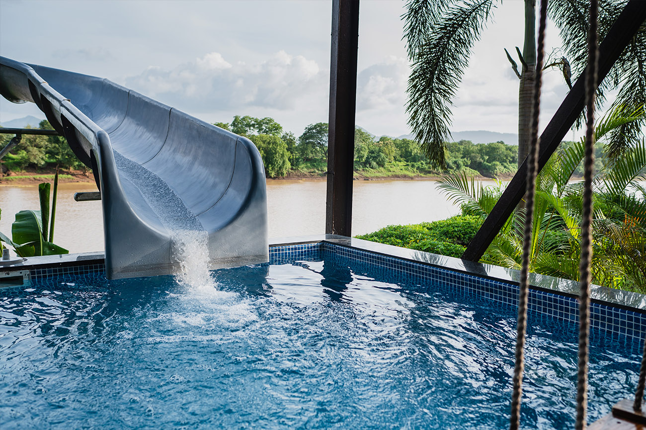 There's also a waterslide connecting from your balcony straight into the shaded swimming pool. Swing, slide, or admire aesthetic mastery – seize the day!