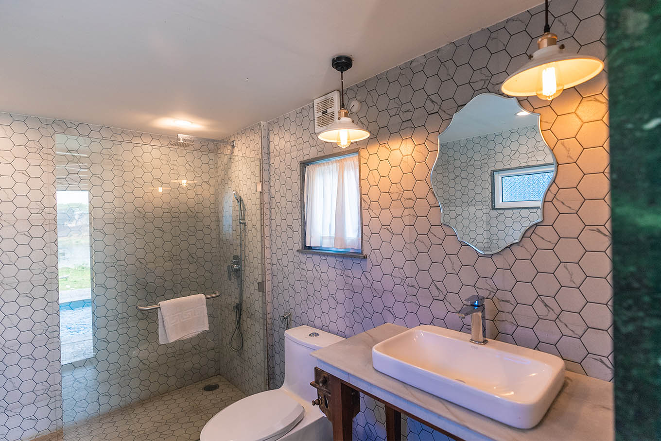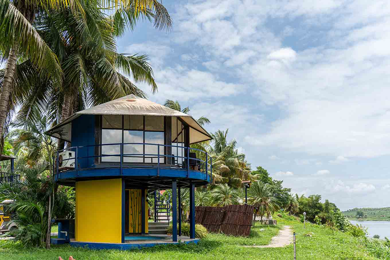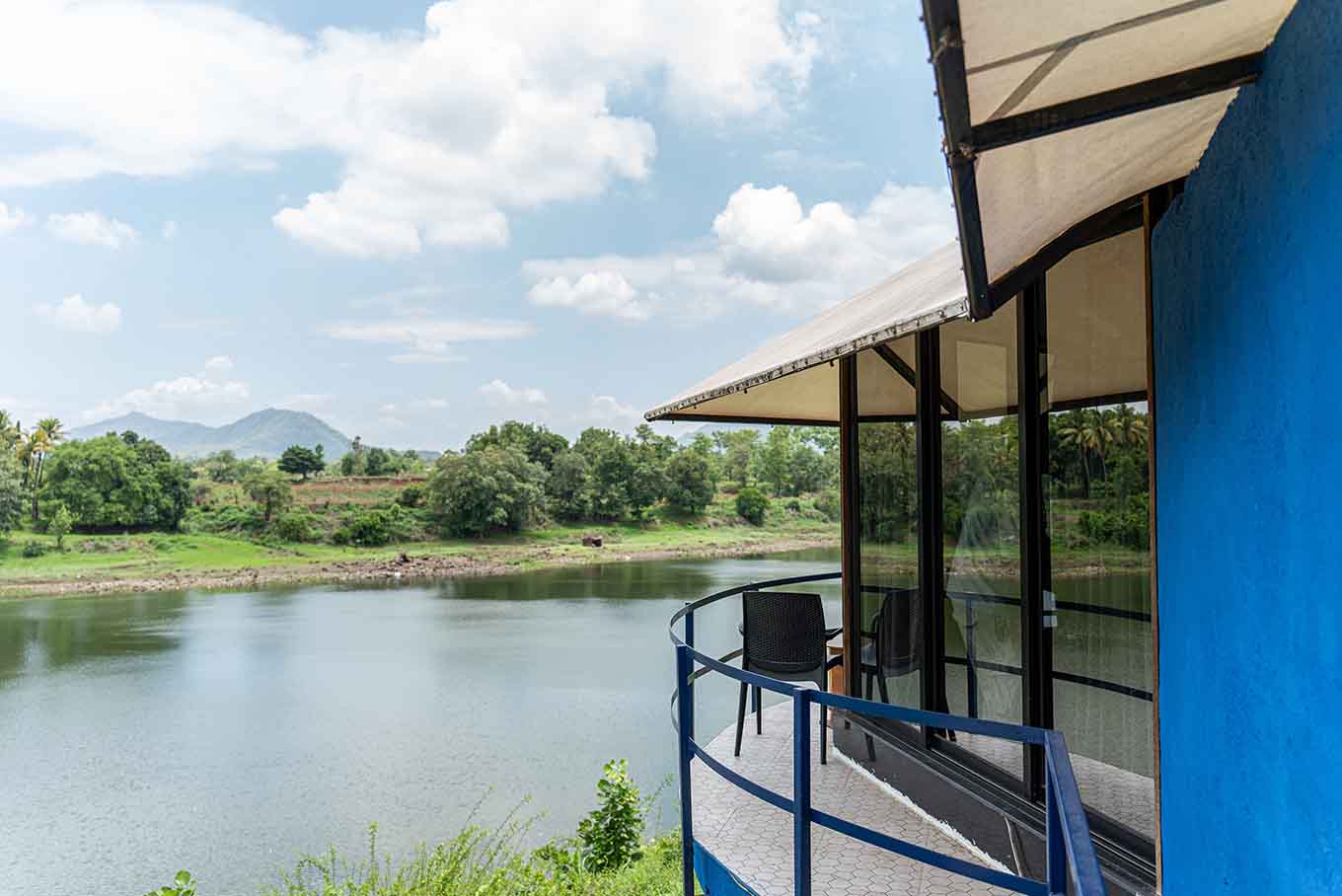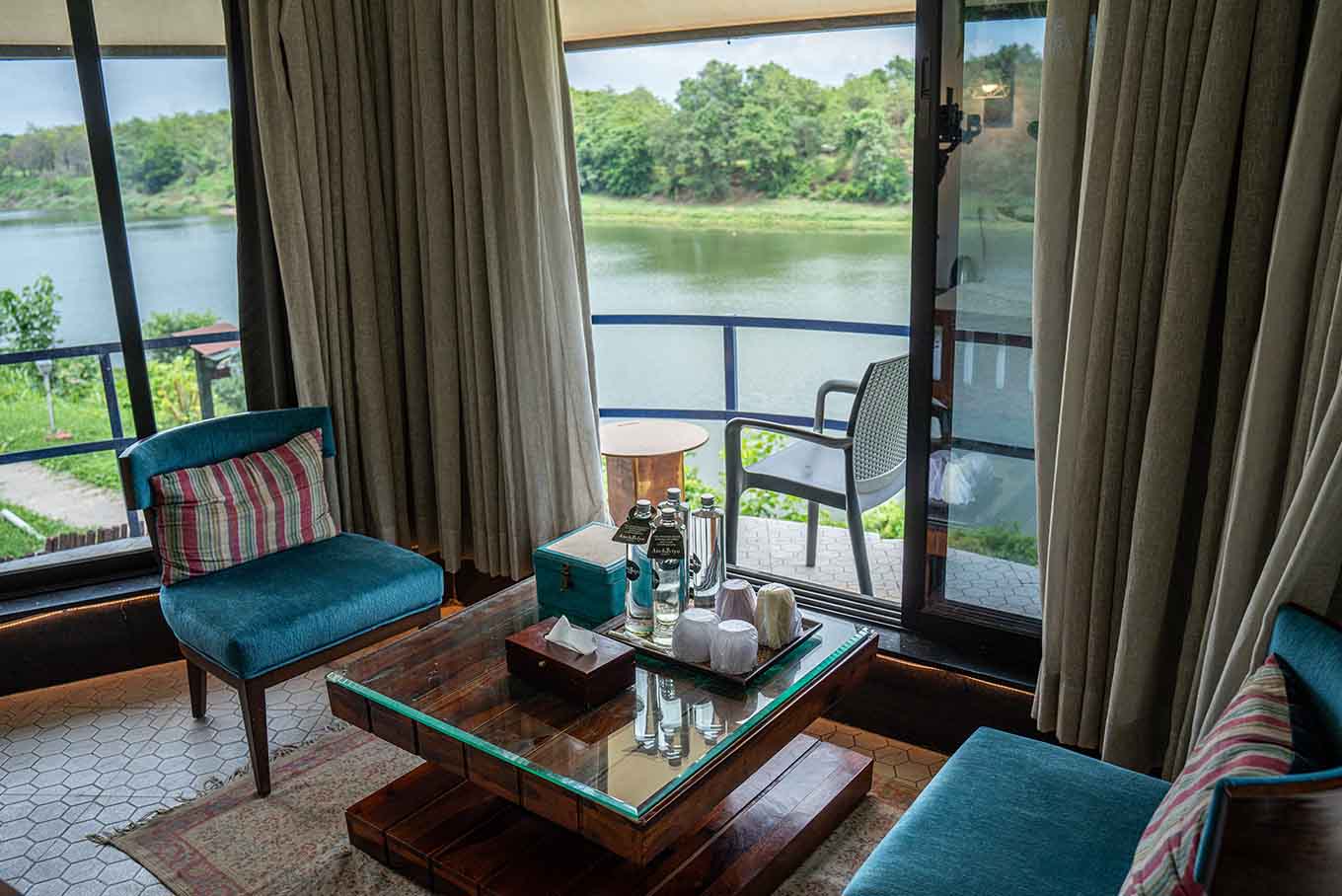 Our Hex room comes with sublime interiors imitating a tropical backdrop. The lower floor houses a circular pool, the washroom showcases blue hexagonal mirrors, the space above presents an exquisite view of the gorgeous river. What's more, the bedroom aesthetics unfold into a luxury in-room experience, and the arc-like balcony allows for an almost aerial river view.