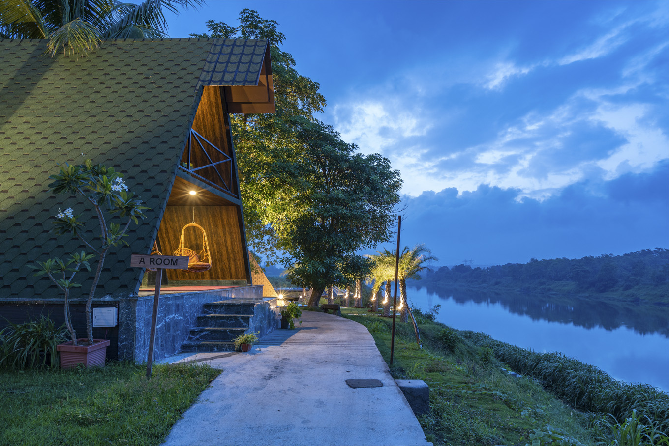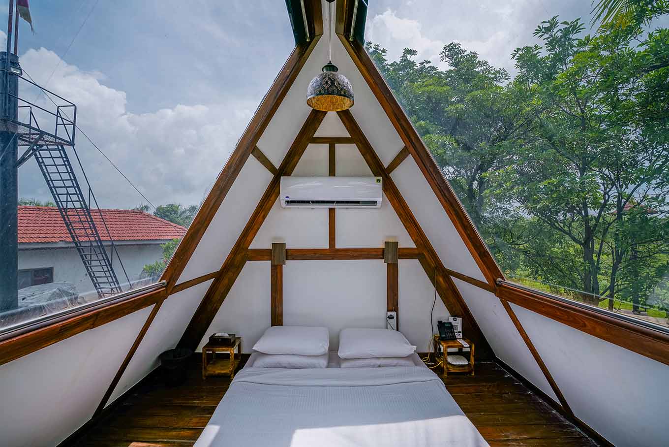 This A-shaped chalet comes in 2 levels. The lower level occupies the living room, bathroom and a comfortable open-air seating territory, while the upper level has a compact, minimalist room and sleek river view balcony. Even better, the glass windows bolster amplified natural lighting while making a perfect spot for unadulterated views of mother earth.