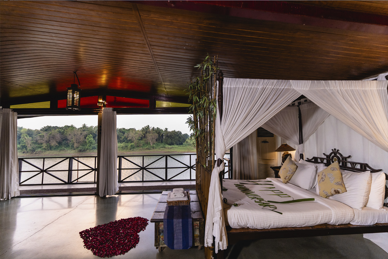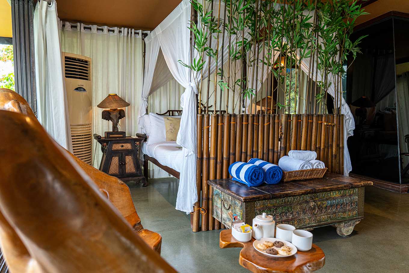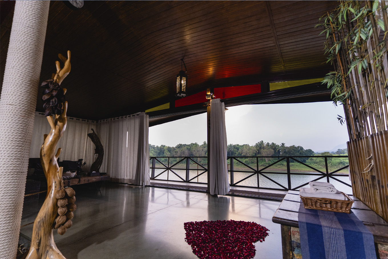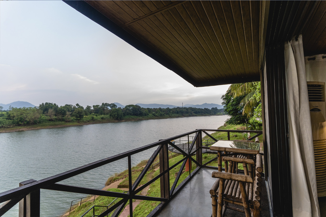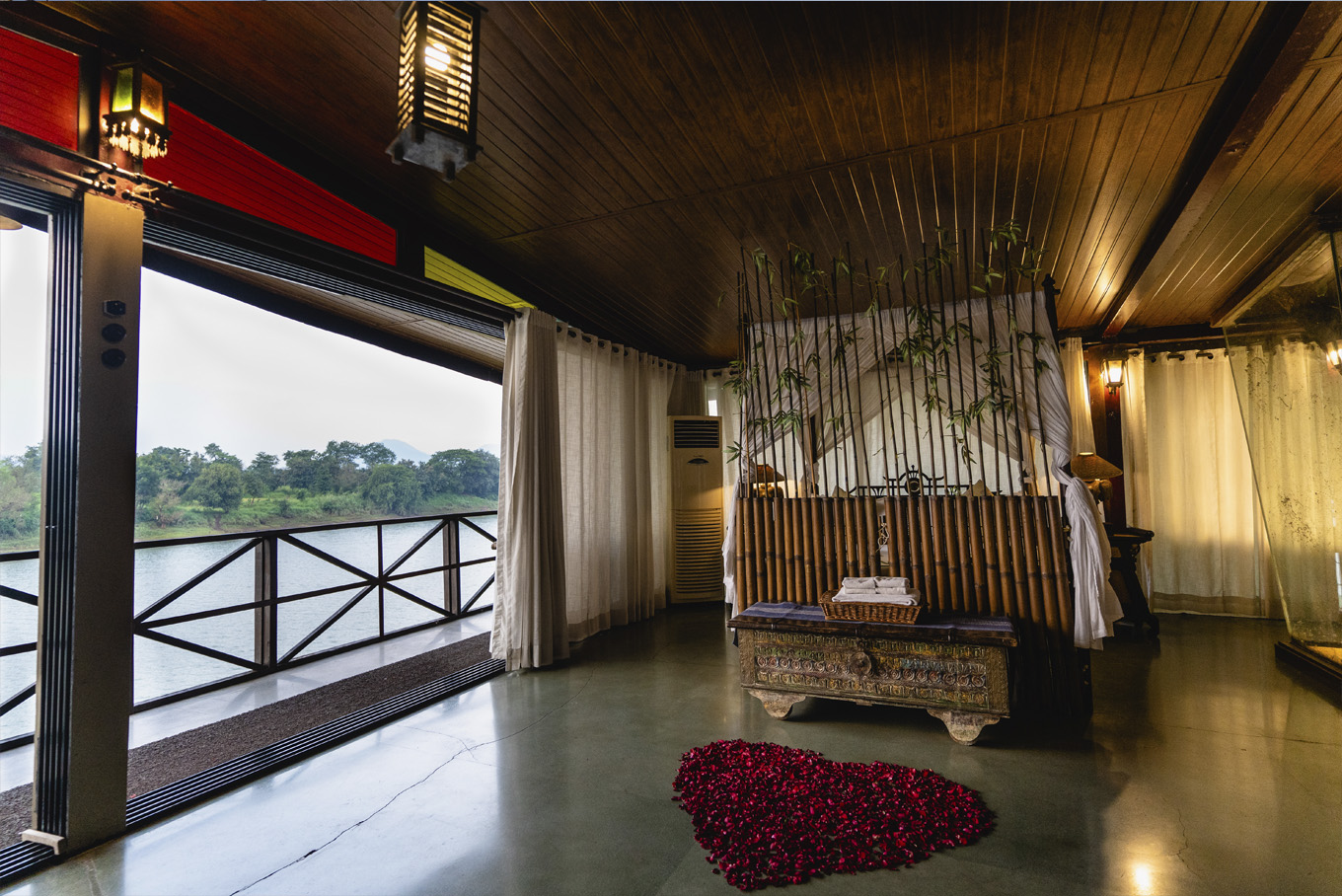 Walking up a charming little spiral staircase will lead you right to the center of the beautiful chalet, built around a majestic Peepul Tree. The seating area by the river, and the dining table that overlooks the football field, are perfect for long conversations or pensive musings. With a grand, four-poster bed that can accommodate two, the Tree House is the perfect hideout for a couple looking to get lost in nature. Please note, the plunge pool in the Tree house, is not a jacuzzi.